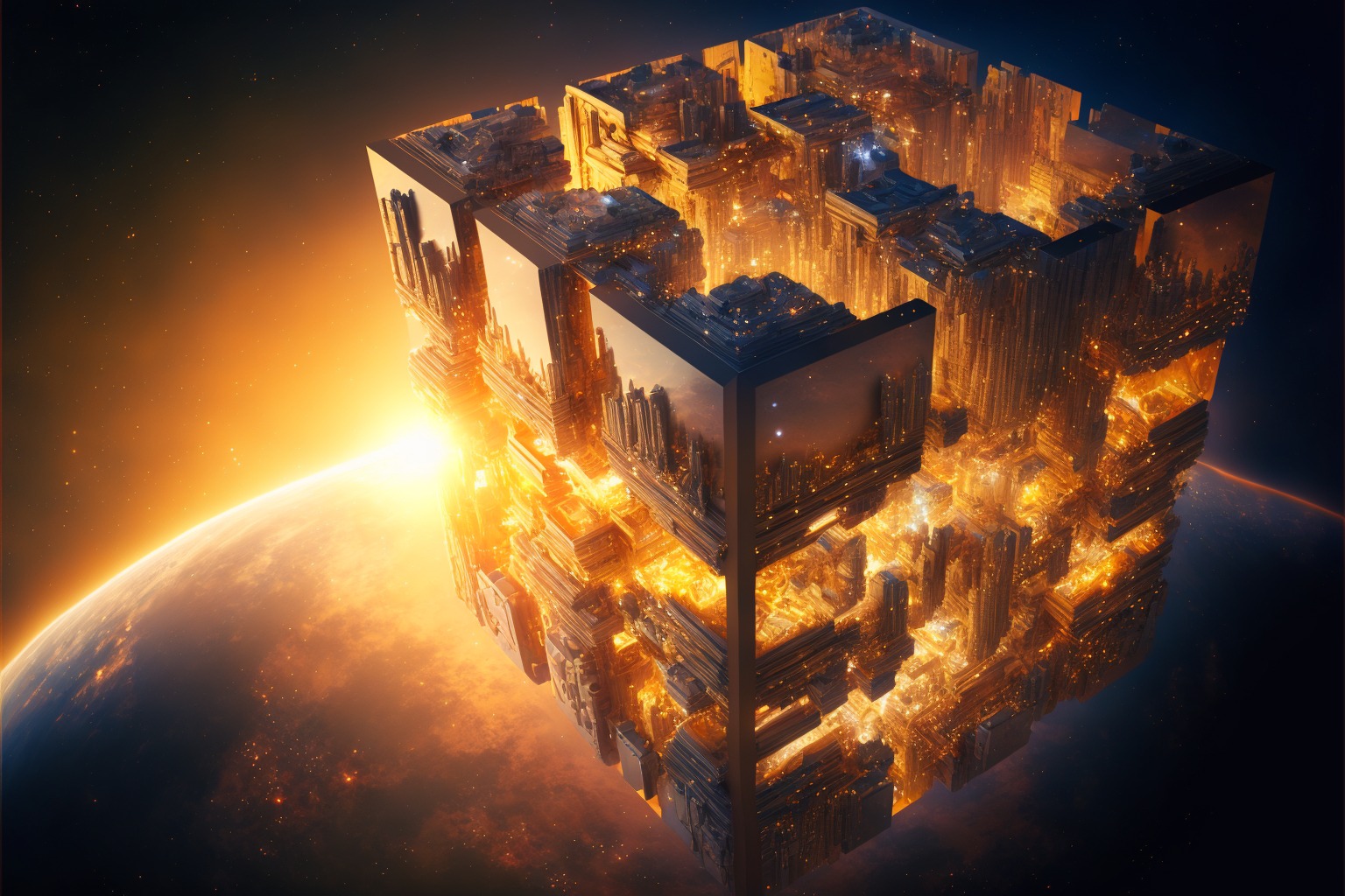 “a massive cube city in high orbit above earth, about the same distance to the moon, fifteen hundred miles long wide and tall, translucent walls, twelve foundations of different colored precious stones, gold streets, illuminated inside by the brilliant light of God, so bright it lights the earth, high resolution, fine details, 4k, unreal engine 5 –ar 3:2”